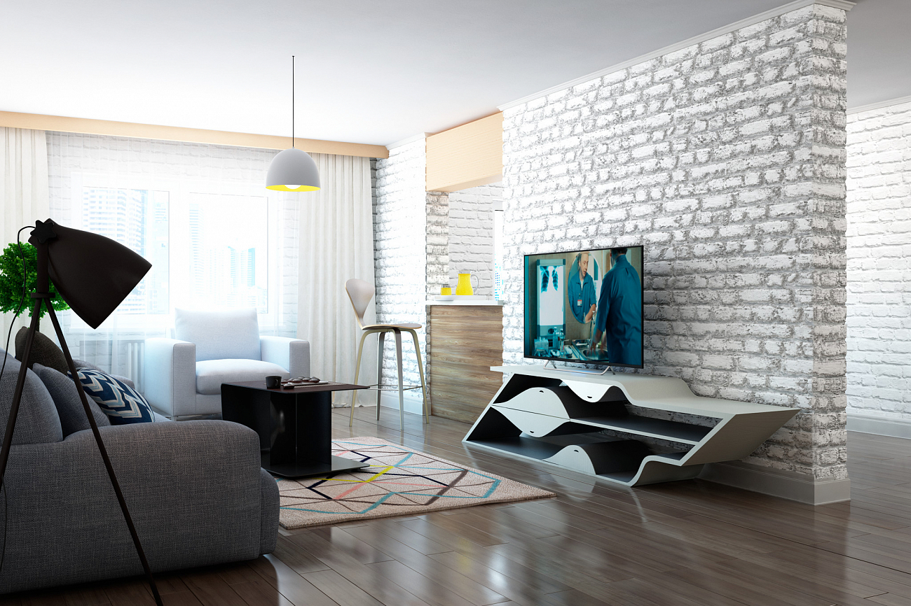 Тумба вдохновлена движением, полность функциональна, выдерживает большой вес сверху, есть четыре небольших выдвижных ящика