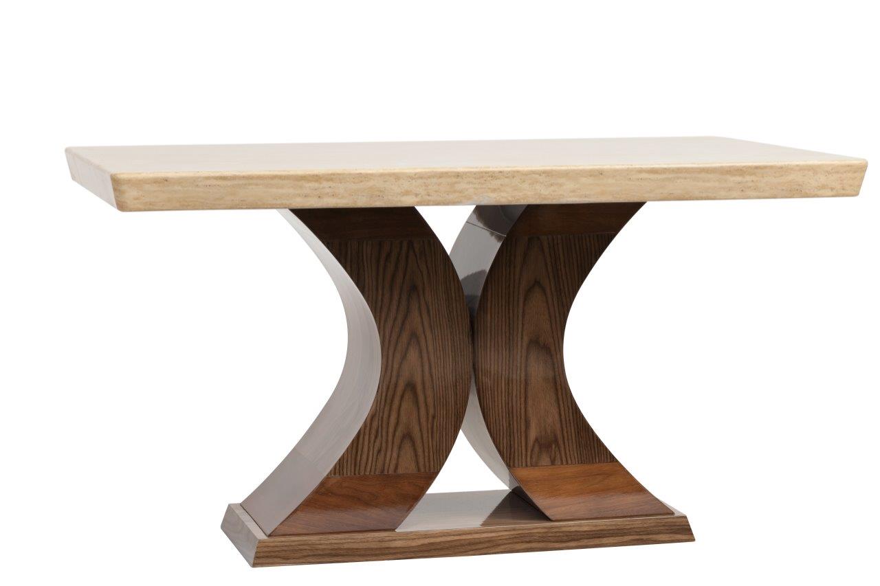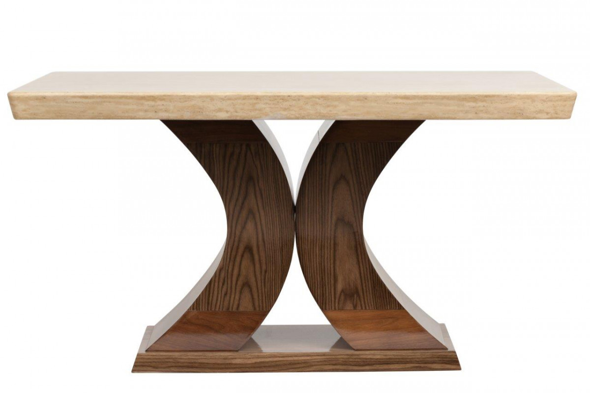 Этот обеденный стол представляет собой результат творческой дизайнерской мысли и воплощает современные тенденции. Сейчас в моде достаточно грубый стиль — мебель, которая выглядит, как будто она сделана мастерами вручную. Стол Fabrice выглядит основательно. Его столешница классической прямоугольной формы сделана из натурального мрамора, а фигурные ножки в форме полукругов — из МДФ и буковой фанеры.